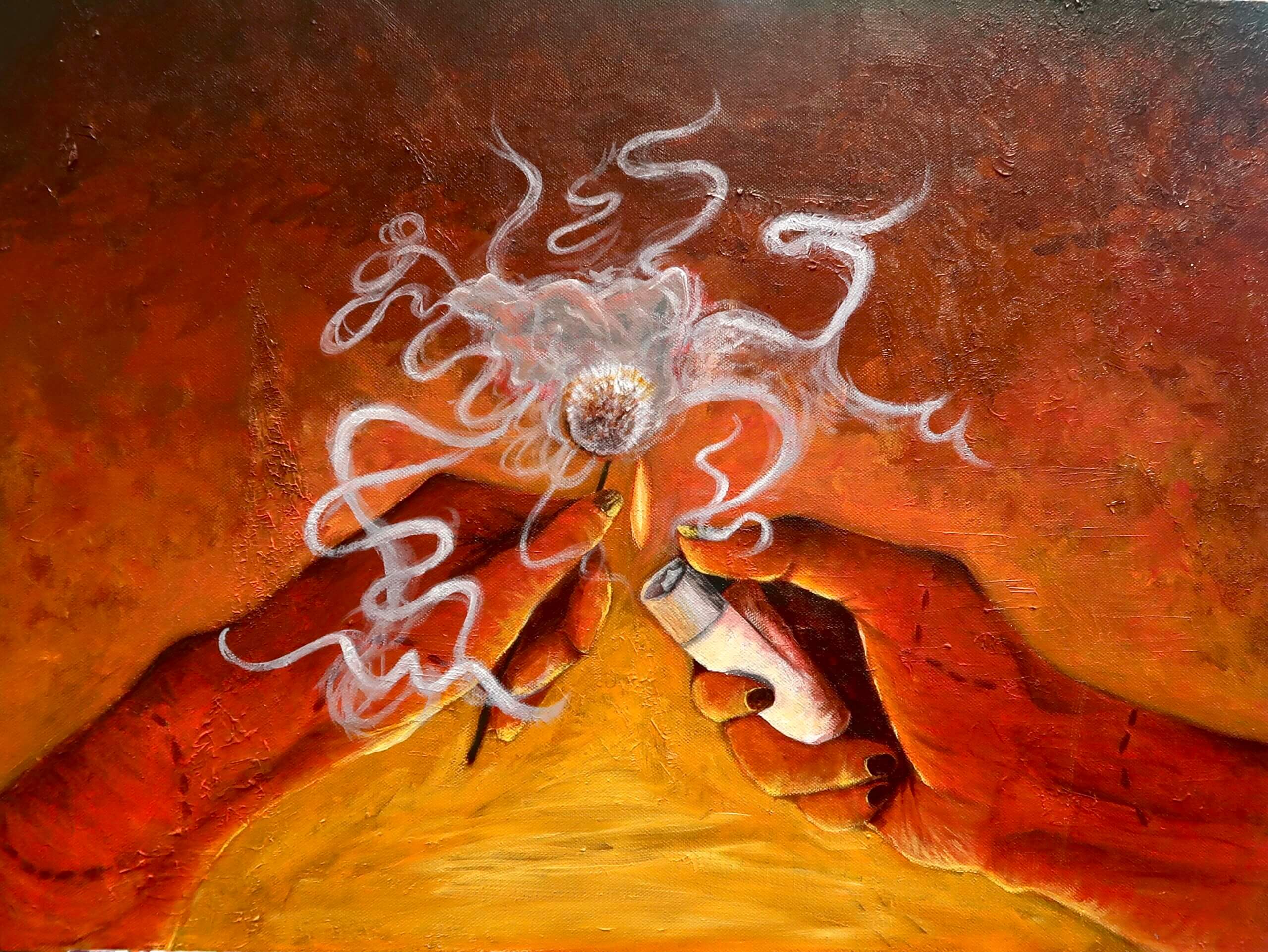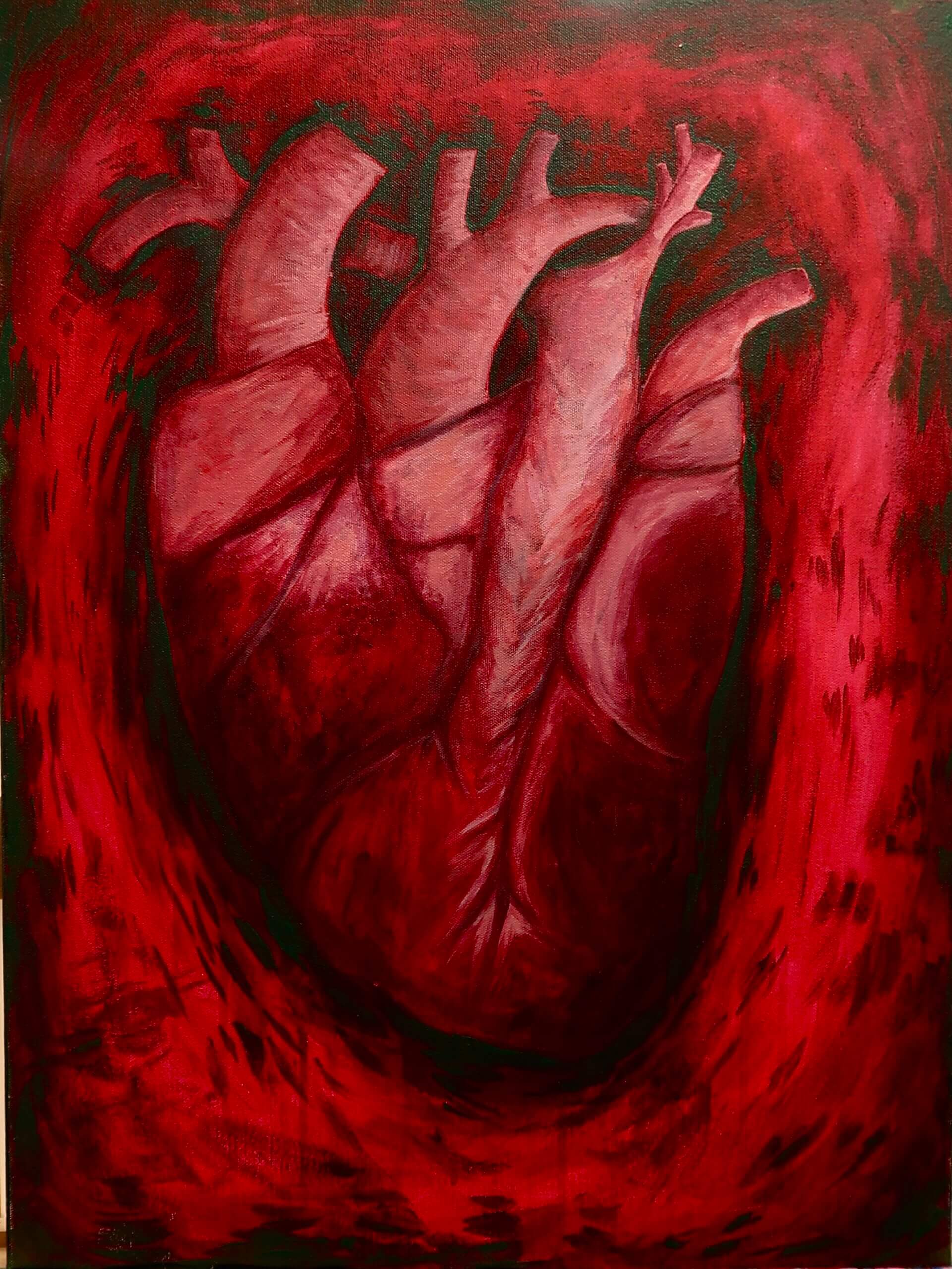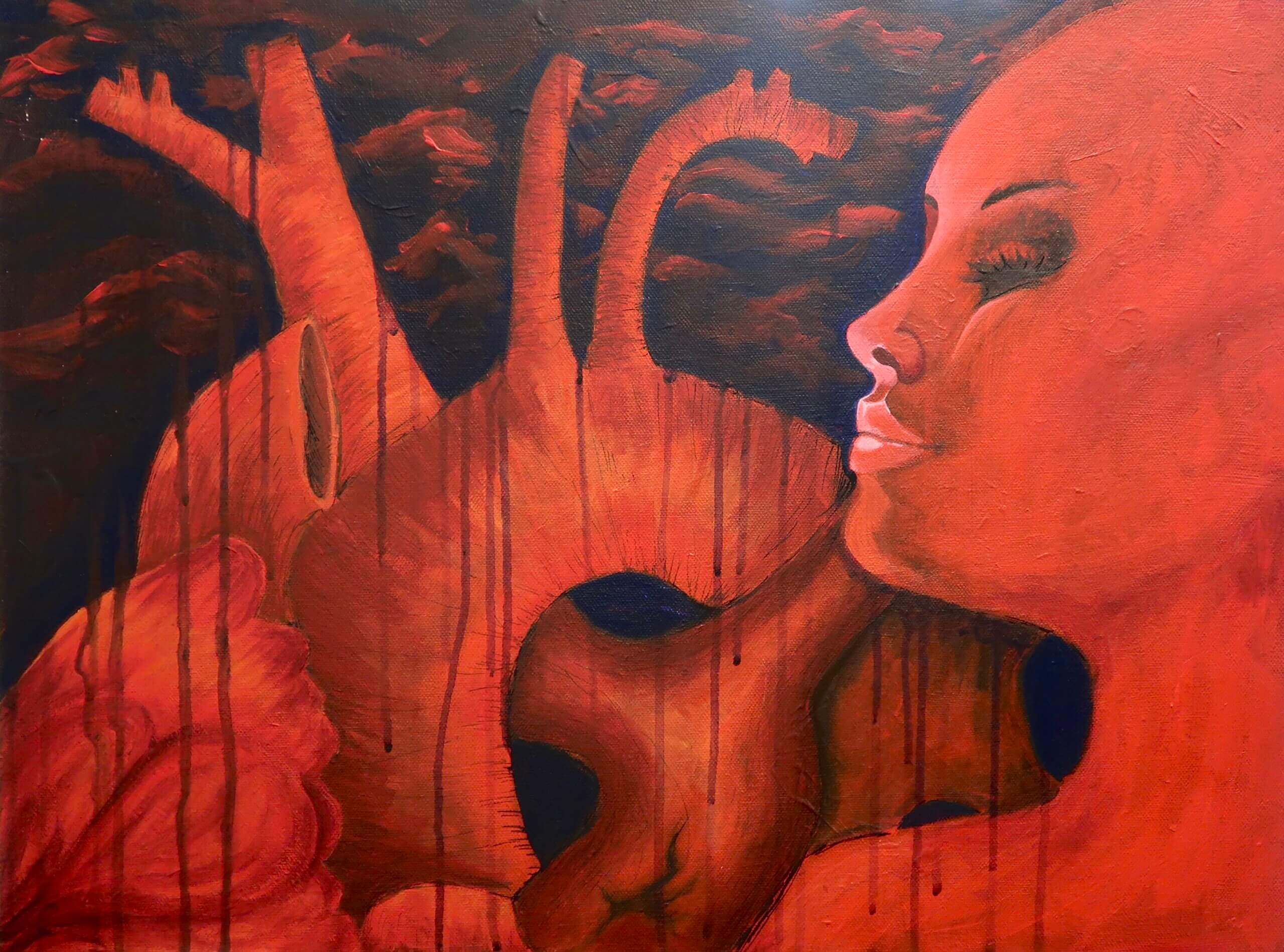 In my collection of works, I wanted to explore the raw emotions associated with human connection and how humans express themselves. Human connection right now is so important because people can find it hard to be vulnerable and authentic to themselves. Even with access to almost every human on the planet, we find ourselves disconnected from what human connection is on the emotional, spiritual and physical levels. In the paintings that depict my idea of emotion, I incorporate a theme of red because, historically, the colour has many different meanings. I also use various forms of technology to give examples of how we have found ways to express ourselves. My works are supposed to be subjective; I want the viewer to have their own ideas of what my collection means to them, just like how they mean something to me.